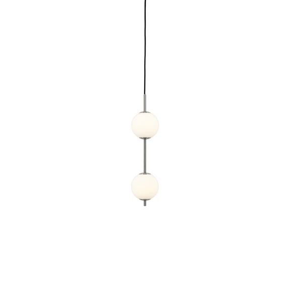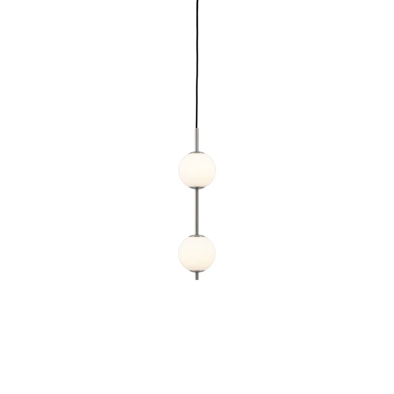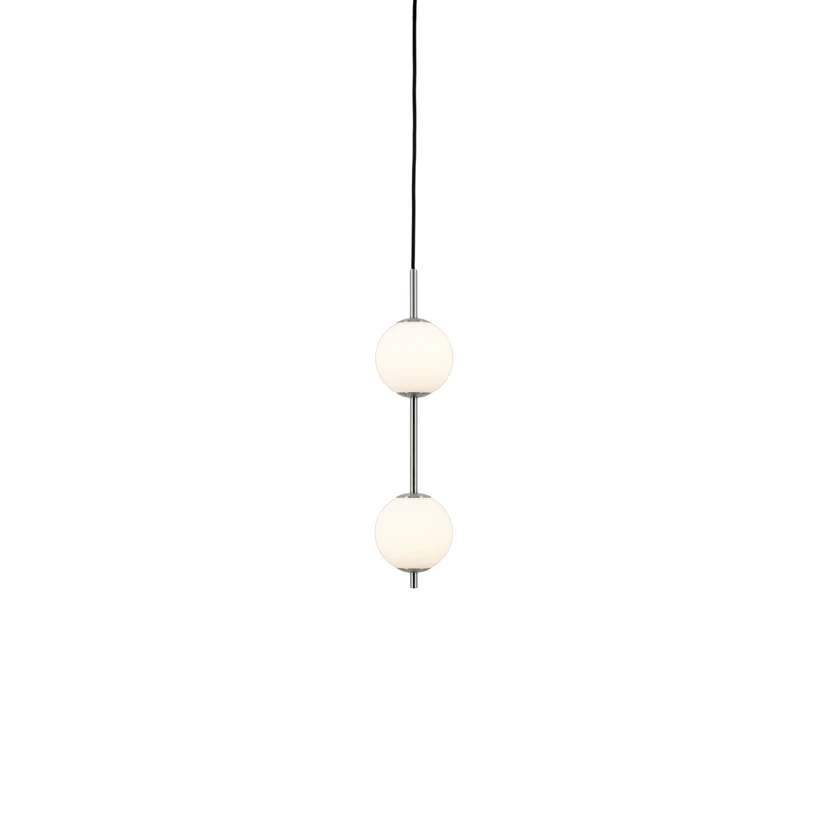 Candeeiro suspenso LED Audrey em aço com duas esferas de vidro opalino – a elegância combina com uma luz branco quente com elevada reprodução cromática
