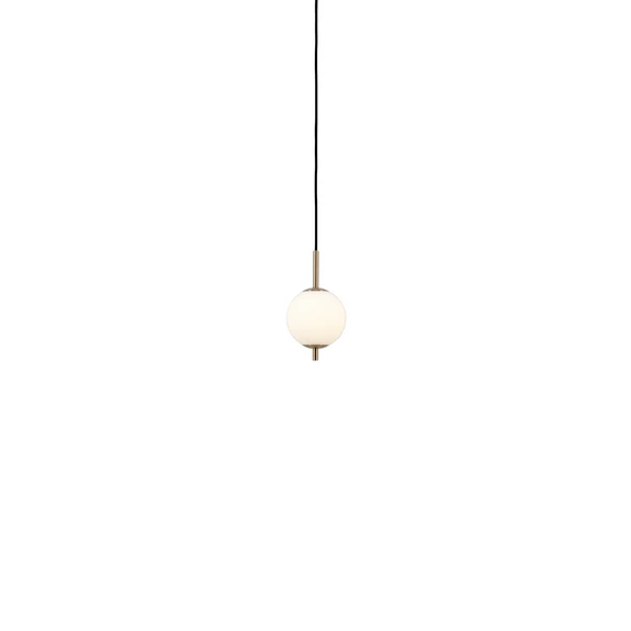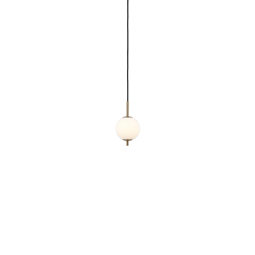 Candeeiro suspenso LED Audrey em latão com esfera em vidro opalino – elegância aliada a luz branco quente com elevada reprodução cromática
