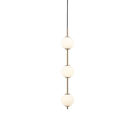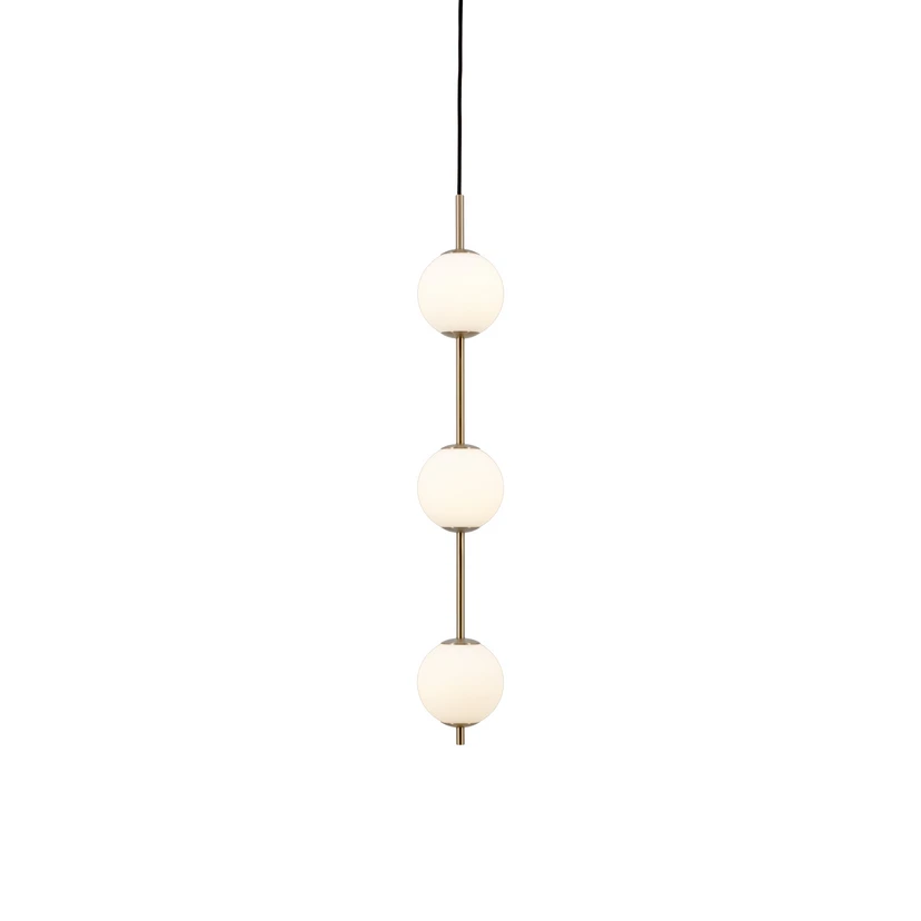 Candeeiro suspenso LED Audrey em latão com três esferas de vidro opalino – elegância aliada a luz branca quente com elevada reprodução cromática